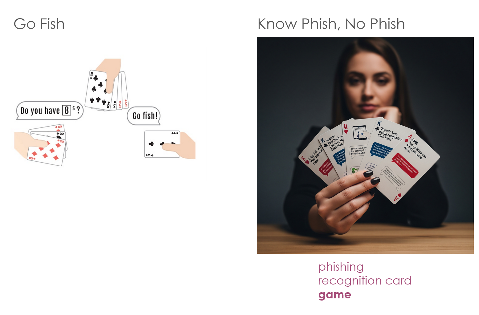 An example could be to make learning about phishing scams fun by playing a card game similar to the widely-loved "Go Fish" that uses printed samples of real phishing scams as playing cards. Use the same rules as the "Go Fish" card game.